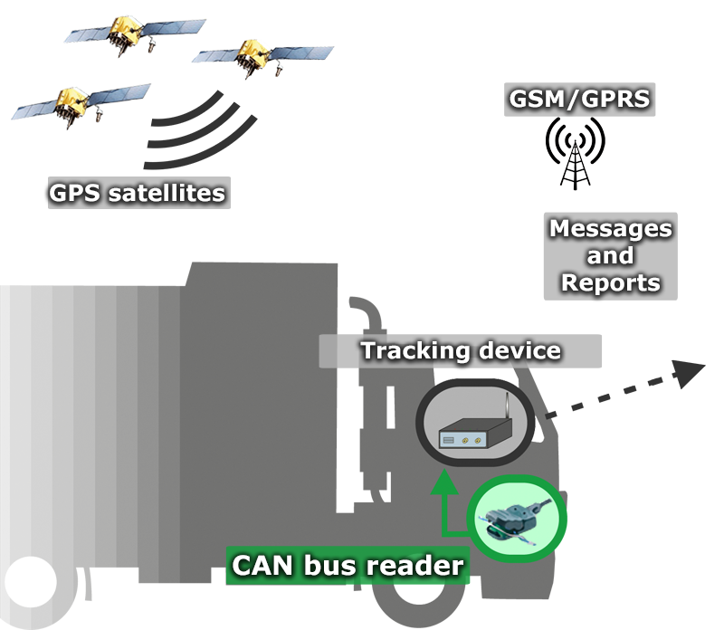 - Data collection from standard vehicle sensors: fuel consumption, fuel level, operation time and etc. (see the specifications of J1939 and J1708).
